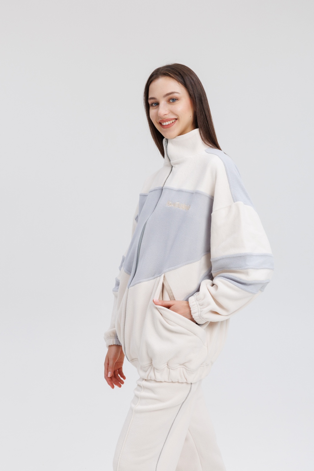 Костюм включает куртку на молнии с удобными карманами и брюки с эластичным поясом — комфорт в каждой детали.